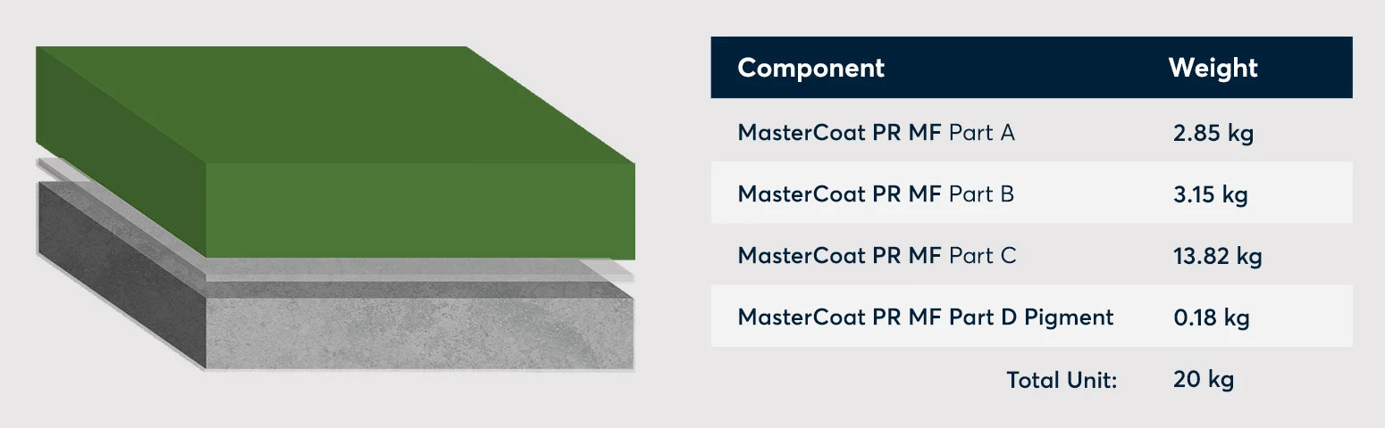 MasterCoat PR MF provides an impact resistant surface with resistance to abrasion, chemical attack, and other forms of physical and mechanical based surface activity. The material is resistant to organic acids, dilute mineral acids, vegetable and animal fats, petroleum oils and solvents.