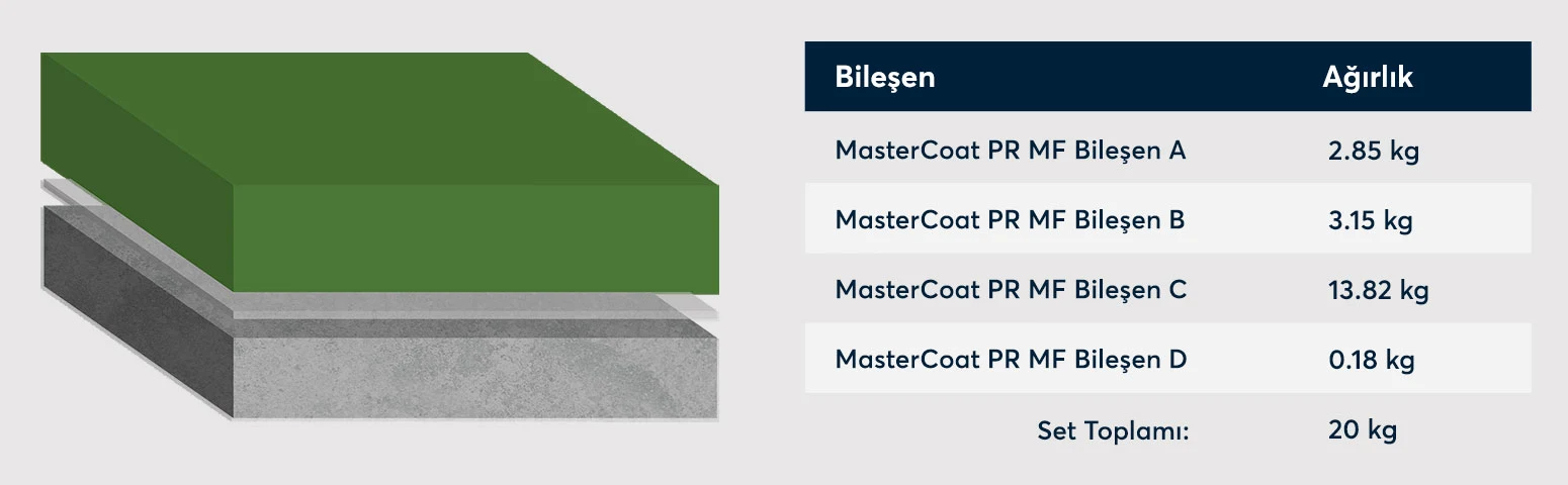 MasterCoat PR MF, aşınmaya, kimyasal ve mekanik etkilere karşı mükemmel dayanım sağlar. Malzeme darbelere, organik, seyreltik mineral asitlere, bitkisel, hayvansal ve petrol yağlarına ve solventlere karşı dayanıklı zemin kaplama sistemidir.